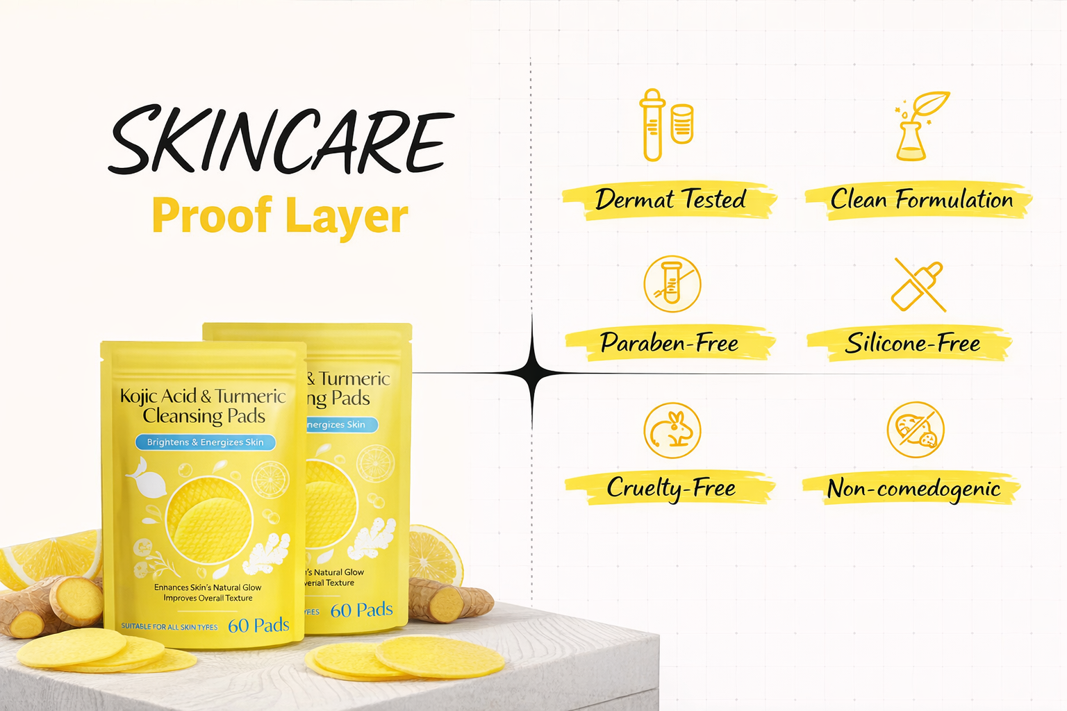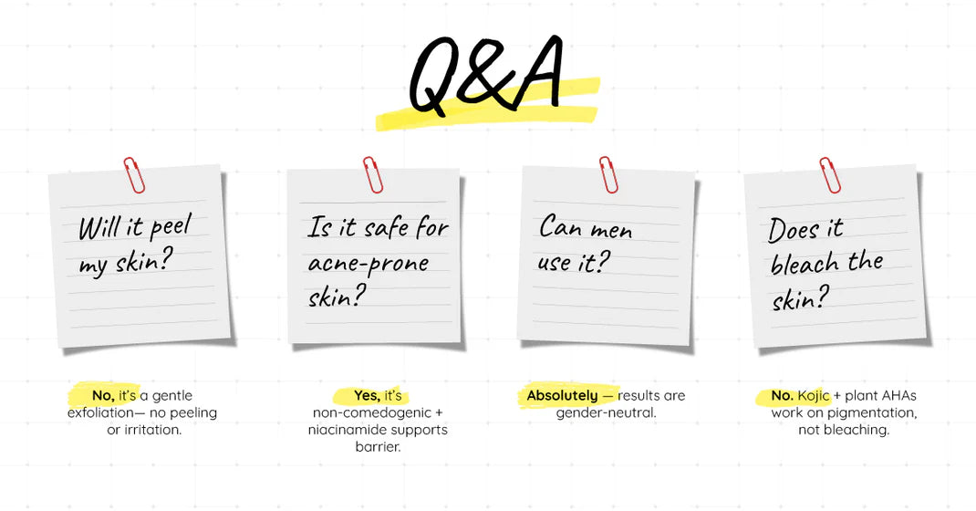 Our pads combine the brightening power of kojic acid with turmeric's anti-inflammatory benefits, providing gentle exfoliation while soothing and nourishing your skin. They are effective, natural, and dermatologist-approved.